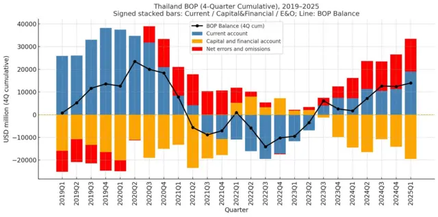 กราฟแสดงดุลบัญชีเดินสะพัดของประเทศไทย ตั้งแต่ไตรมาสแรกของปี 2562 ถึงไตรมาสแรกของปี 2568 โดยจะแบ่งเป็นกราฟแท่งซ้อนสีต่าง ๆ ซึ่งแต่ละสีแสดงองค์ประกอบของดุลบัญชีเดินสะพัด ได้แก่ บัญชีเดินสะพัด (สีน้ำเงิน), บัญชีทุนและการเงิน (สีเหลือง) และตัวเลขที่แสดงความคลาดเคลื่อนเชิงสถิติ หรือ NEO (สีแดง) ส่วนเส้นสีดำจะบ่งบอกยอดรวมหรือดุลบัญชีเดินสะพัดสะสมในแต่ละไตรมาส