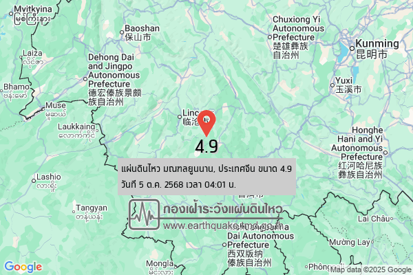 แผ่นดินไหวขนาด 4.9 มณฑลยูนนาน, ประเทศจีน 2025-10-05 04:01:46 ตามเวลาประเทศไทย