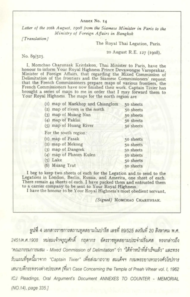 ภาพเอกสารราชการสถานทูตสยามในกรุงปารีสเมื่อปี ค.ศ.1908 ที่หม่อมเจ้าจรูญศักดิ์ กฤดากร อัครราชทูตสยามประจำฝรั่งเศส ทรงกล่าวถึงคณะกรรมการปักปันผสมว่า “ได้ทำหน้าที่สำเร็จแล้ว”