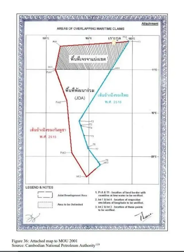ขณะที่ MOU 2544 หมายถึง บันทึกความเข้าใจระหว่างรัฐบาลไทยกับรัฐบาลกัมพูชาว่าด้วยพื้นที่ที่ไทยและกัมพูชาอ้างสิทธิในไหล่ทวีปทับซ้อนกัน โดยตัวเลขพ่วงท้ายหมายถึงปีที่ทั้งสองประเทศลงนามในบันทึกความเข้าใจดังกล่าว