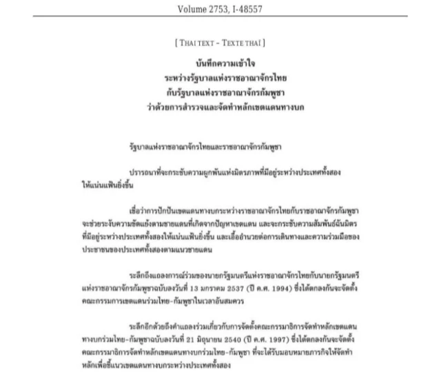 “โดยจะวางกรอบและกลไกในการปฏิบัติงานบนพื้นฐานของการเคารพเส้นเขตแดนระหว่างประเทศทั้งสองที่ได้จัดทำขึ้นระหว่างสยามกับฝรั่งเศสเมื่อต้นคริสต์ศตวรรษที่ 20 และจะไม่มีการเปลี่ยนแปลงแก้ไขเส้นเขตแดนแต่อย่างใด เพราะทั้งสองฝ่ายไม่ประสงค์ให้มีการได้หรือเสียดินแดน ทั้งนี้ ทั้งสองฝ่ายจะสำรวจและจัดทำหลักเขตแดนในภูมิประเทศเพื่อให้เห็นแนวเขตแดนอย่างชัดเจนเท่านั้น” กต. อธิบายในหนังสือดังกล่าว