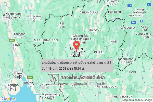 แผ่นดินไหวขนาด 2.3 ต.เมืองยาว อ.ห้างฉัตร จ.ลำปาง 2025-10-18 15:14:30 ตามเวลาประเทศไทย