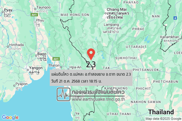 แผ่นดินไหวขนาด 2.3 ต.แม่หละ อ.ท่าสองยาง จ.ตาก 2025-10-21 18:15:Forty eight ตามเวลาประเทศไทย