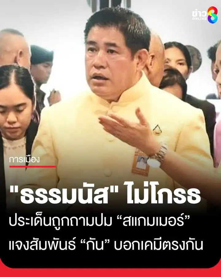“ธรรมนัส” ไม่โกรธประเด็นถูกถามปมสแกมเมอร์ บอกให้ “เบน สมิธ” พิสูจน์ตัวเองก่อน อย่าเพิ่งกล่าวหา ยันไม่เคยทำธุรกิจที่อยู่บนความเดือดร้อนของประชาชน ลั่นมีตังค์ก่อนเล่นการเมือง รับ เคมีตรงกับ “กัน จอมพลัง” ยันไม่เคยช่วยเรื่องเงิน มองเป็นรสชาติชีวิต เพราะเป็นนักการเมืองมีแสง เลยอาจถูกดับไปบ้าง และยัง เอ่ยปากชื่นชม “ไอซ์ รักชนก” ทำหน้าที่ได้ดี