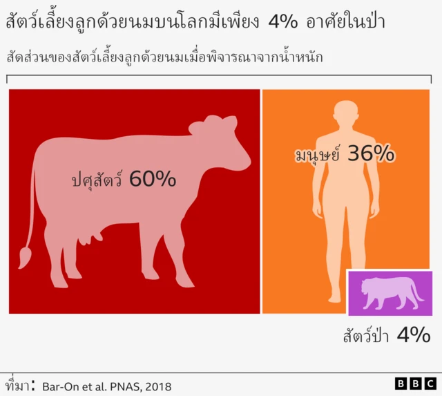 ในการศึกษาชิ้นหนึ่งที่เผยแพร่ในปี 2018 ได้พบว่า ผลรวมน้ำหนักตัวหรือชีวมวลของมนุษย์และปศุสัตว์รวมกันคิดเป็น 96% ของสัตว์เลี้ยงลูกด้วยนมทั้งหมดในโลก