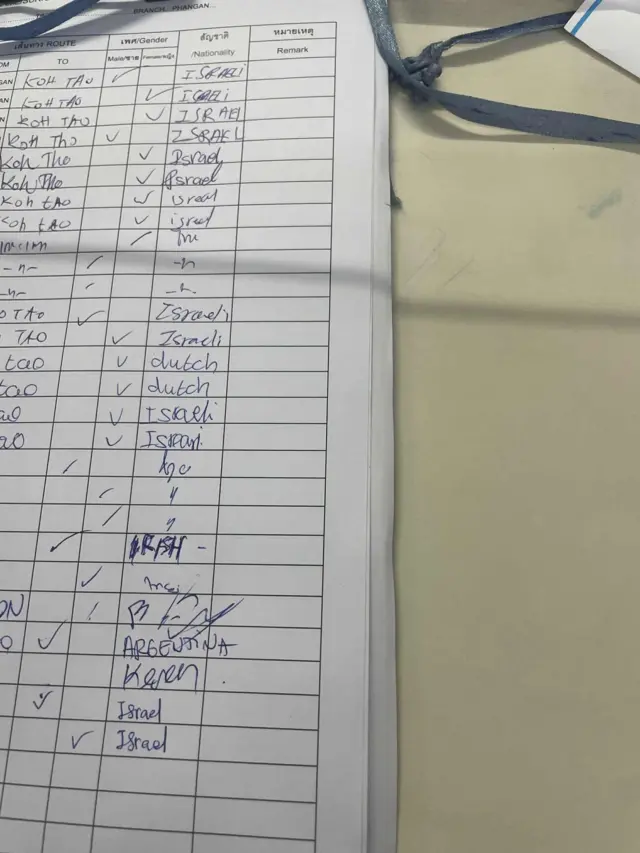 ระหว่างที่.เดินทางออกจากเกาะพะงัน จ.สุราษฎร์ธานี ด้วยเรือรอบเที่ยงของวันที่ 16 ต.ค. ที่ผ่านมา เราได้เห็นเอกสารลงทะเบียนรายชื่อผู้โดยสารบนเรือจากเกาะพะงันไปยังเกาะอื่น ๆ ในบริเวณใกล้เคียงในวันดังกล่าว ซึ่งอาจเป็นเบาะแสหนึ่งที่ชี้ว่ามีคนอิสราเอลมาเดินทางมาเยือนเกาะกลางอ่าวไทยแห่งนี้มากน้อยเพียงใด