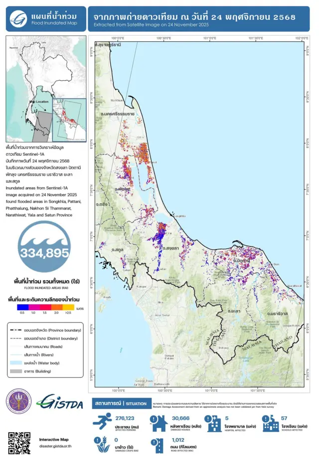 กานดาศรีอธิบายว่า GISTDA ได้นำข้อมูลความสูงภูมิประเทศมารวมกับข้อมูลดาวเทียมเพื่อประเมินความลึกของน้ำท่วม โดยข้อมูลจากวันที่ 24 พ.ย. 2568 พบพื้นที่น้ำท่วมขังรวม 334,895 ไร่ ใน 7 จังหวัดภาคใต้ตอนล่าง โดยเฉพาะอย่างยิ่งในพื้นที่ อ.หาดใหญ่ และบริเวณลุ่มน้ำที่ไหลลงสู่ทะเลสาบสงขลา มีการแสดงสีน้ำเงินเข้มและสีม่วง ซึ่งบ่งชี้ถึงระดับน้ำที่วิกฤตเกินกว่า 2.5 เมตร