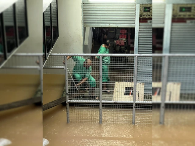 ภาพช่วงเวลาที่เจ้าหน้าที่ รพ.หาดใหญ่ กำลังเร่งวิดน้ำเพื่อทำให้มั่นใจว่าน้ำจะไม่ท่วมเข้าไปยังพื้นที่ที่เครื่องกำเนิดไฟฟ้าตั้งอยู่