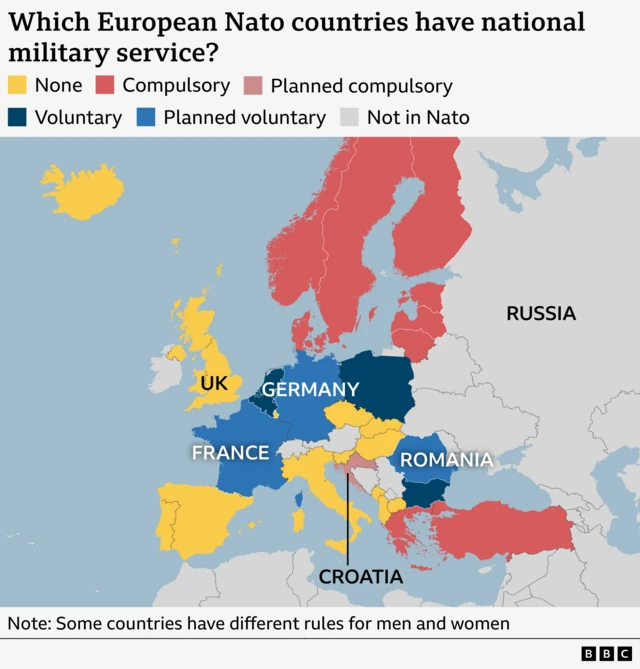 ในบทความนี้ บีบีซีพาไปสำรวจว่ากระแสเปิดรับสมัครทหารใหม่กำลังเกิดขึ้นใน 30 ประเทศสมาชิกนาโตอย่างไร และมีประเทศใดบ้างที่กองทัพยังคงใช้การเกณฑ์ทหารอยู่