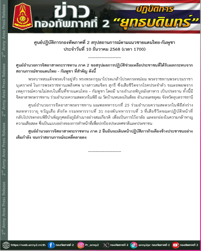 สำนักข่าวอิศรา . รายงานว่า วันที่ 10 ธันวาคม 2568 ศูนย์ปฏิบัติการกองทัพภาคที่ 2 สรุปสถานการณ์ตามแนวชายแดนไทย-กัมพูชา ประจำวันที่ 10 ธันวาคม 2568 ณ เวลา 17.00 น.