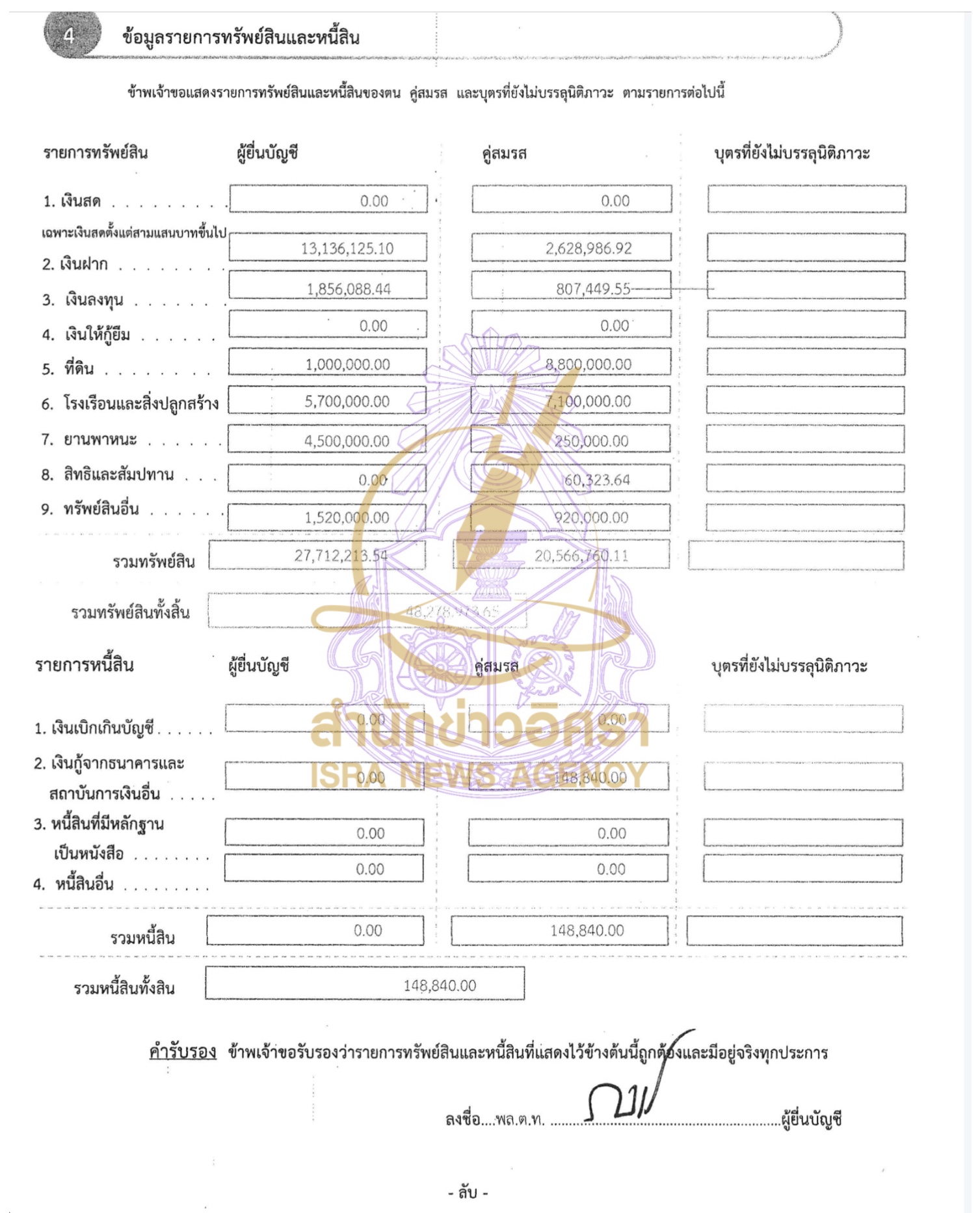 พลตำรวจโทภาณุรัตน์ และนางจันทร์ทิพา หลักบุญ คู่สมรส แจ้งมีทรัพย์สินทั้งสิ้น Forty eight,278,973 บาท แจ้งมีหนี้สินทั้งสิ้น 148,840 บาท