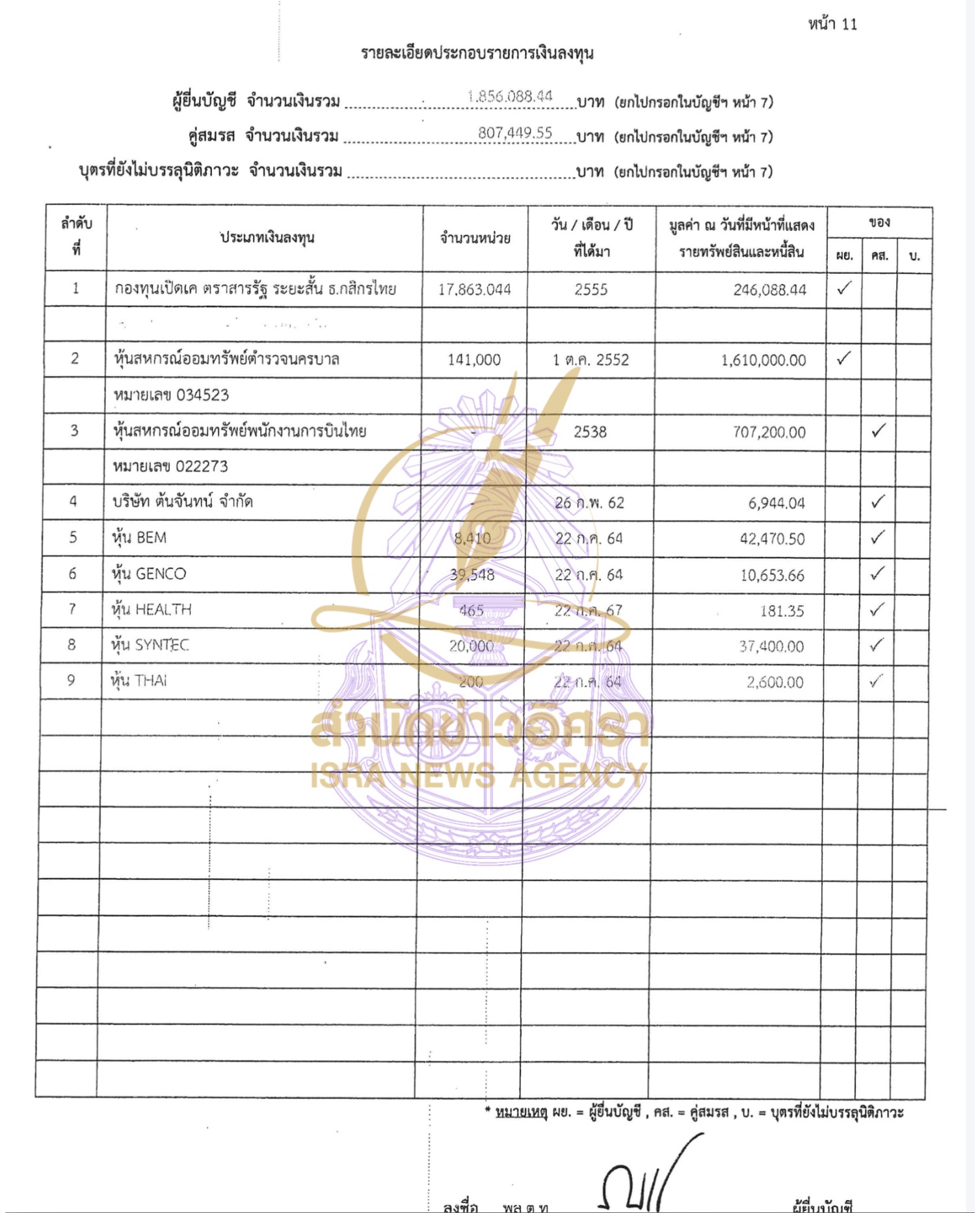 นางจันทร์ทิพา แจ้งมีรายได้ต่อปีโดยประมาณ 172,000 บาท ประกอบด้วย ดอกเบี้ย/ปันผล 100,000 บาท ค่าเช่าคอนโด 72,000 บาท แจ้งมีรายจ่ายต่อปีโดยประมาณ 144,468 บาท