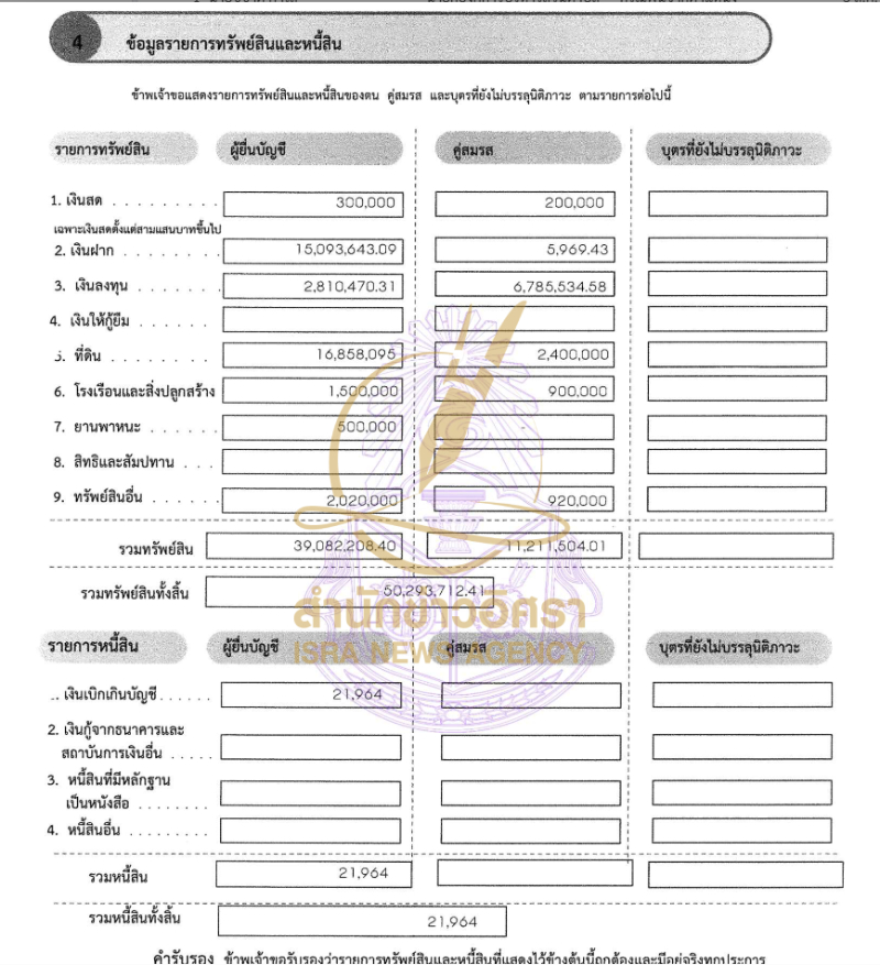นางวันทนีย์ แจ้งมีทรัพย์สิน 39,082,208 บาท ประกอบด้วย เงินสด 300,000 บาท เงินฝาก 15,093,643 บาท เงินลงทุน 2,810,470 บาท ที่ดิน 14 แปลงในจังหวัดนนทบุรี เพชรบุรี หนองคาย รวมมูลค่า 16,858,095 บาท โรงเรือนและสิ่งปลูกสร้าง 3 หลังในจังหวัดนนทบุรี รวมมูลค่า 1,500,000 บาท ยานพาหนะ รถยนต์ 1 คัน 500,000 บาท ทรัพย์สินอื่น เช่น สร้อยคอทองคำ เข็มกลัดเพชร ชุดเครื่องประดับ เป็นต้น รวมมูลค่า 2,020,000 บาท แจ้งมีหนี้สิน 21,964 บาท ทั้งหมดเป็นเงินเบิกเกินบัญชี