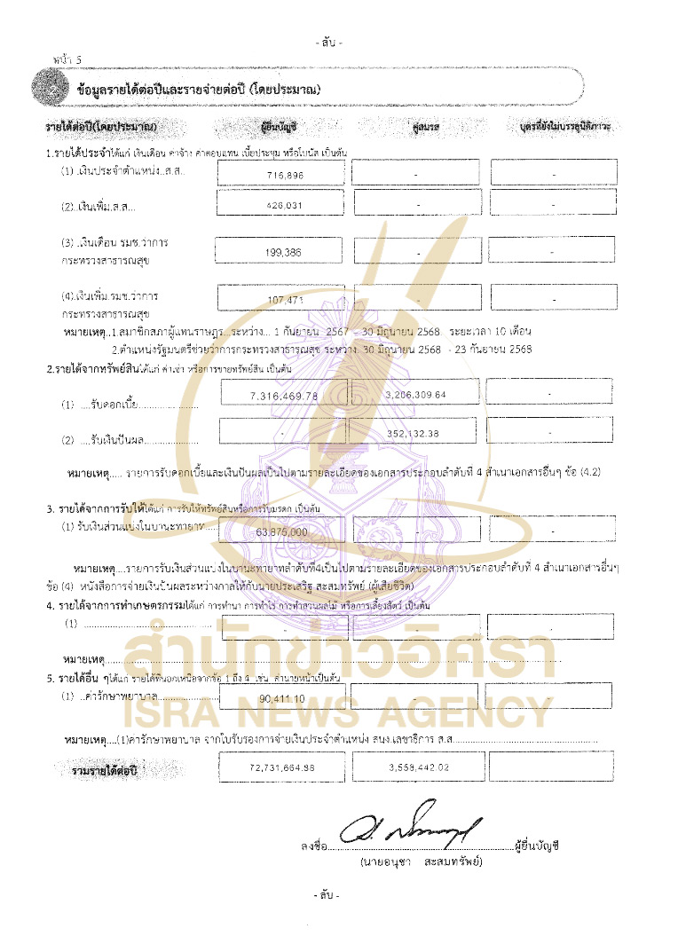 นายอนุชา แจ้งมีรายได้ต่อปีโดยประมาณ 72,๐731,664.88 บาท จากเงินเดือน ดอกเบี้ย เงินปันผล และค่ารักษาพยาบาล