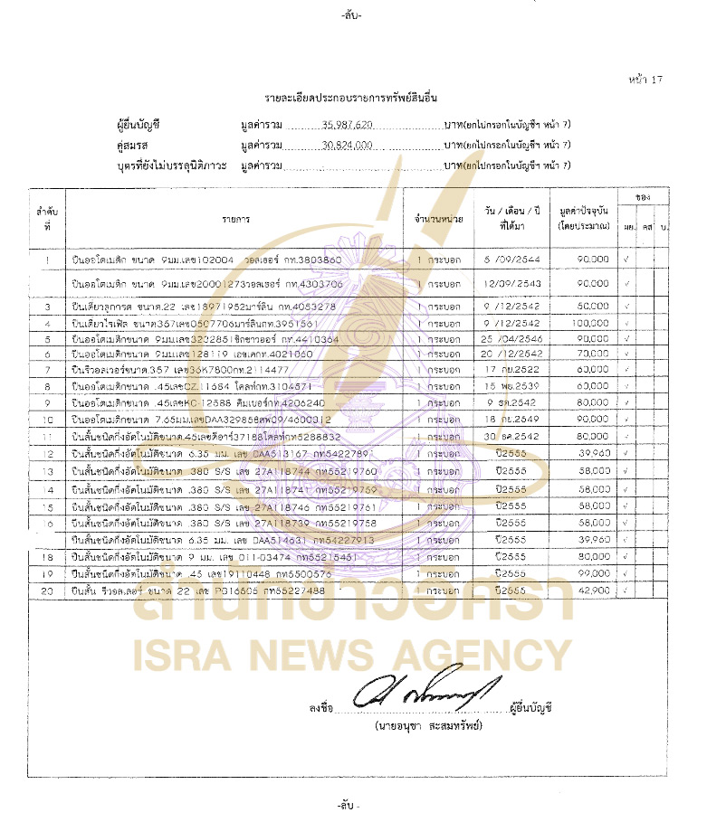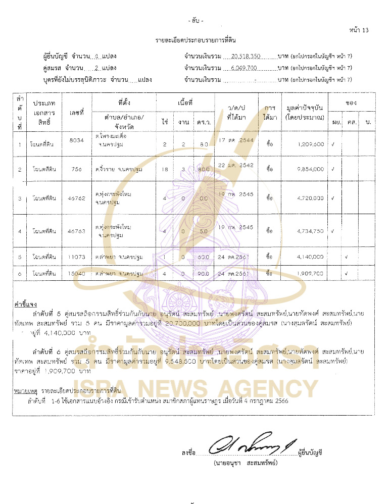 เปิดรายละเอียดบัญชีทรัพย์สิน ‘อนุชา สะสมทรัพย์' กรณีพ้นจากตำแหน่ง รมช.กระทรวงสาธารณสุข ทรัพย์สิน 480 ล้าน รายได้ 72 ล./ปี ปืน 40 กระบอก พระ 11 องค์ งาช้าง 1 คู่ ที่ดิน 4 แปลงใน จ.นครปฐม