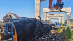 ตู้โดยสารบางส่วนของขบวนรถไฟเกิดไฟลุกไหม้หลังจากเครนขนาดยักษ์หล่นทับ