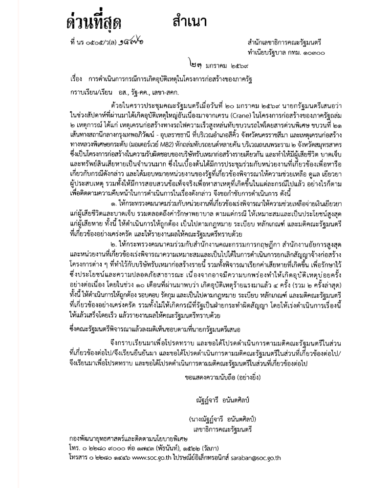 สำนักข่าวอิศรา . รายงานว่า วันที่ 24 มกราคม 2569 รายงานข่าวจากทำเนียบรัฐบาลเปิดเผยว่า ในการประชุมคณะรัฐมนตรี (ครม.) เมื่อวันที่ 20 มกราคม 2569 นายอนุทิน ชาญวีรกูล นายกรัฐมนตรีและรัฐมนตรีว่าการกระทรวงมหาดไทย เสนอความคิดเห็นถึงเหตุการณ์เครนถล่ม 2 เหตุการณ์คือ เครนก่อสร้างรถไฟความเร็วสูงไทย-จีน หล่นทับขบวนรถไฟโดยสารพิเศษขบวนที่ 21 เส้นทางสถานีกลางกรุงเทพอภิวัฒน์ – อุบลราชธานี และเครนก่อสร้างมอเตอร์เวย์สาย M82 หักถล่มทับรถยนต์หลายคัน บนถนนพระราม 2 เพื่อติดตามความคืบหน้าในการดำเนินการ จึงมีการกำชับการดำเนินการ ดังนี้
