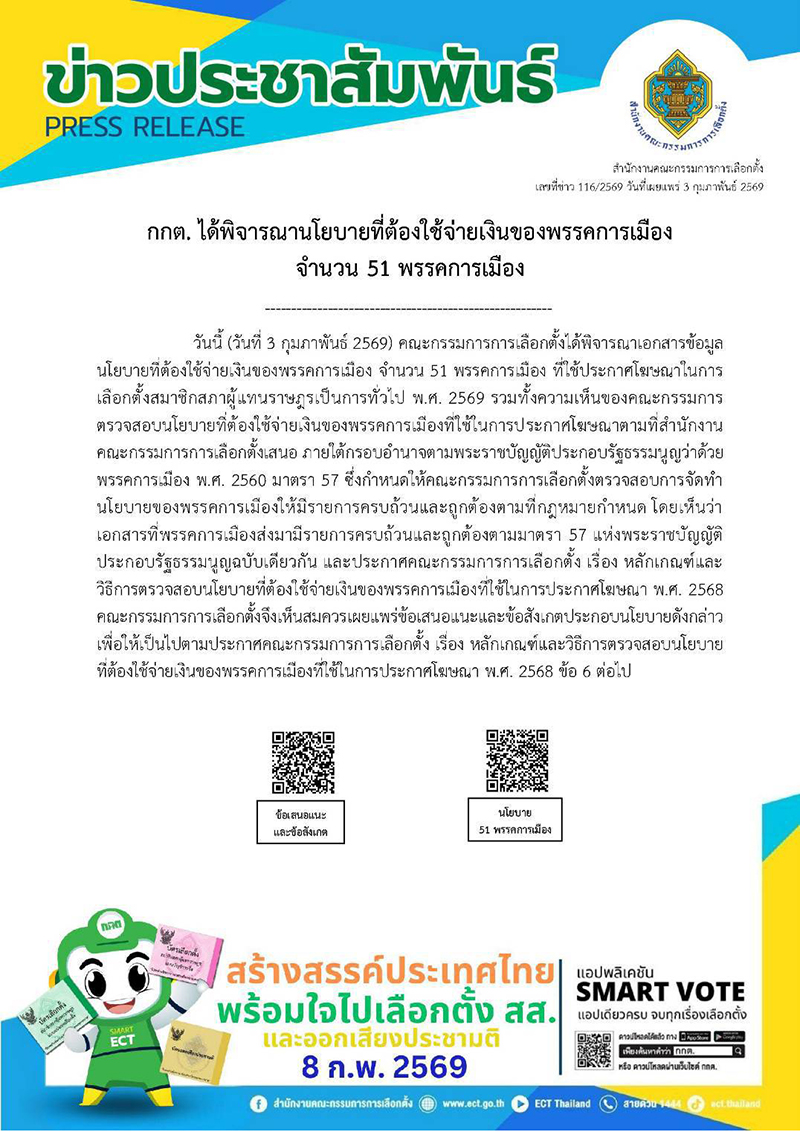 สำนักข่าวอิศรา . รายงานว่า วันที่ 3 กุมภาพันธ์ 2569 สำนักงานคณะกรรมการการเลือกตั้ง (กกต.)เผยแพร่ ข่าวประชาสัมพันธ์ (PRESS RELEASE) เรื่อง กกต. ได้พิจารณานโยบายที่ต้องใช้จ่ายเงินของพรรคการเมือง จำนวน 51 พรรคการเมือง ที่ใช้ประกาศโฆษณาในการเลือกตั้งสมาชิกสภาผู้แทนราษฎร (สส.) เป็นการทั่วไป พ.ศ. 2569 รวมทั้งความเห็นของคณะกรรมการตรวจสอบนโยบายที่ต้องใช้จ่ายเงินของพรรคการเมืองที่ใช้ในการประกาศโฆษณา ตามที่สำนักงาน กกต. เสนอ ภายได้กรอบอำนาจตามพระราชบัญญัติประกอบรัฐธรรมนูญ (พ.ร.ป.) ว่าด้วยพรรคการเมือง พ.ศ. 2560 มาตรา 57 และประกาศคณะกรรมการการเลือกตั้ง เรื่อง หลักเกณฑ์และวิธีการตรวจสอบนโยบายที่ต้องใช้จ่ายเงินของพรรคการเมืองที่ใช้ในการประกาศโฆษณา พ.ศ. 2568
