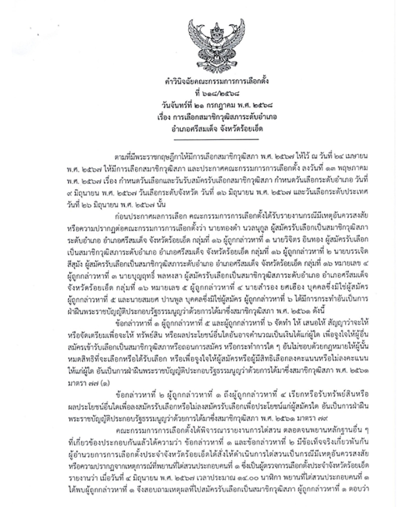 สำนักข่าวอิศรา . วันที่ 4 กุมภาพันธ์ 2569 สำนักงานคณะกรรมการการเลือกตั้ง (กกต.) เผยแพร่คำวินิจฉัยคณะกรรมการ กกต. ที่ 618/2568 เรื่อง การเลือกสมาชิกวุฒิสภา (สว.) ระดับอำเภอ อำเภอศรีสมเด็จ จังหวัดร้อยเอ็ด โดยมีคำสั่งให้ยื่นคำร้องต่อศาลฎีกาเพื่อสั่งเพิกถอนสิทธิสมัครรับเลือกตั้งหรือเพิกถอนสิทธิเลือกตั้ง 10 ปี หรือ 20 ปี แล้วแต่กรณี ของนายทองดำ นวลนุกูล นายวิจิตร อินทอง นายบรรเจิด สีสุมัง และ นายบุญฤทธิ์ พลหงสา ผู้สมัคร สว. ระดับอำเภอฯ กลุ่ม 16 นายสำรอง ยศเฮือง และนายสมยศ ปานพูล ผู้ซึ่งผู้ไม่ใช่ผู้สมัคร ตามพระราชบัญญัติประกอบรัฐธรรมนูญ (พ.ร.ป.) ว่าด้วยการได้มาซึ่ง สว. 2561 มาตรา 62 และรัฐธรรมนูญแห่งราชอาณาจักรไทย พุทธศักราช 2560 มาตรา 226