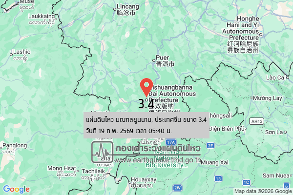 แผ่นดินไหวขนาด 3.4 มณฑลยูนนาน, ประเทศจีน 2026-02-19 05:40:01 ตามเวลาประเทศไทย
