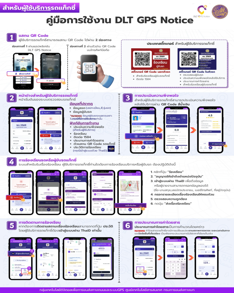 โดยประชาชนสามารถดาวน์โหลดแอปพลิเคชัน DLT GPS NOTICE และขณะใช้บริการแท็กซี่ สามารถสแกน QR Code ที่ติดอยู่บริเวณกระจกหน้าต่างรถ (ทั้งภายนอกและภายใน) เพื่อตรวจสอบข้อมูลรถและผู้ขับขี่ ระบบจะแสดงภาพถ่ายคนขับ, ชื่อ-สกุล, ข้อมูลรถ, วันสิ้นอายุภาษี และสถานะใบอนุญาตขับรถ ทำให้ทราบทันทีว่าเป็นรถที่ถูกต้องตามกฎหมายหรือไม่ รวมถึงสามารถคำนวณค่าโดยสารเบื้องต้น และประเมินความพึงพอใจและร้องเรียนพฤติกรรมผู้ขับขี่ได้ทันทีแบบเรียลไทม์ หากพบปัญหา เช่น ขับรถประมาท หรือวาจาไม่สุภาพ หรือแม้แต่ปฎิเสธผู้โดยสาร ข้อมูลจะถูกส่งตรงเข้าสู่ระบบของกรมการขนส่งทางบก