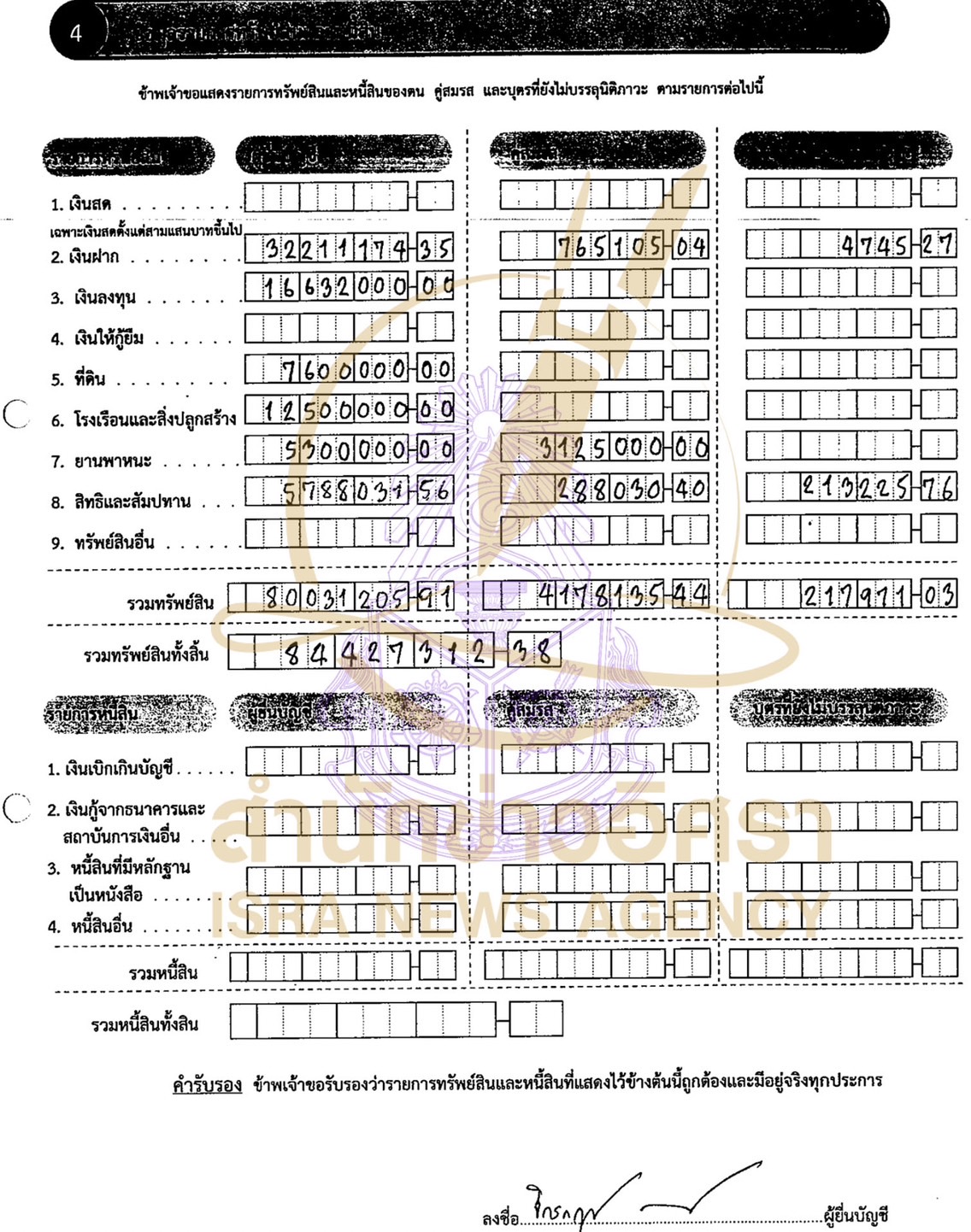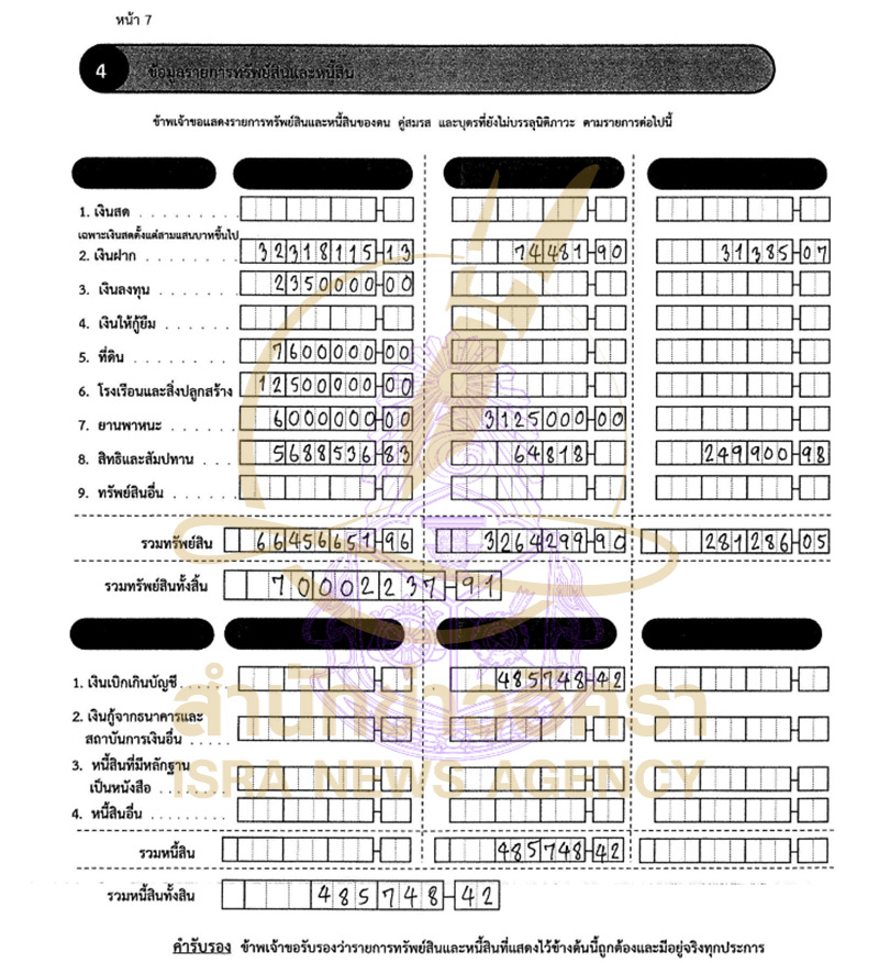 น.ส.ศุภจิรา คู่สมรส มีทรัพย์สินลดลง 913,835.10 บาท และมีหนี้สินเพิ่มขึ้นจากเดิมที่เคยแจ้งว่าไม่มีหนี้สิน เป็นหนี้บัตรเครดิตและเงินเบิกเกินบัญชีรวมประมาณ 4.8 แสนบาท