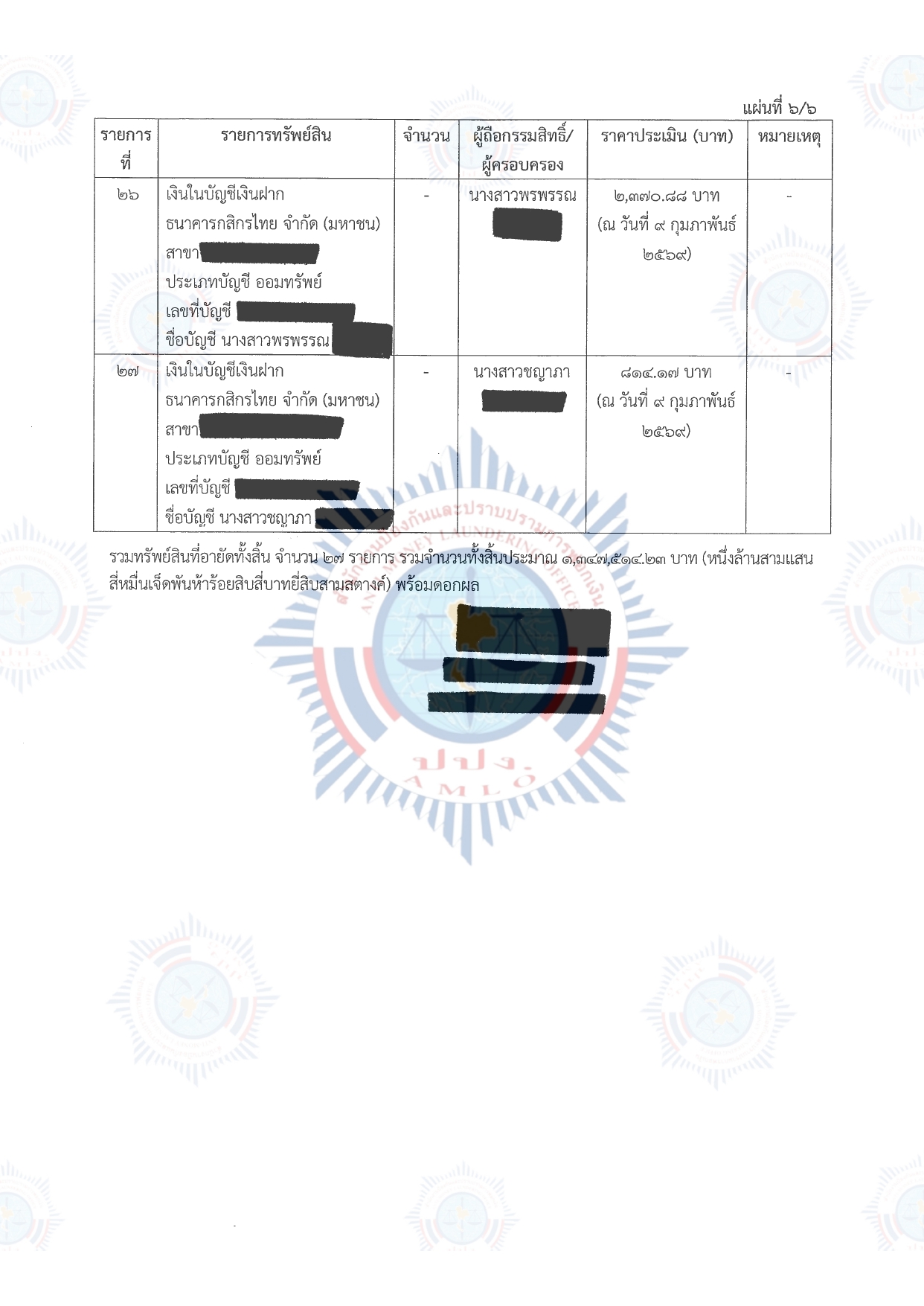 ในการนี้ เพื่อประโยชน์ในการปฏิบัติตามกฎหมายว่าด้วยการป้องกันและปราบปรามการฟอกเงิน คณะกรรมการธุรกรรมได้มอบหมายพนักงานเจ้าหน้าที่ตรวจสอบธุรกรรมหรือทรัพย์สินที่เกี่ยวข้อง ปรากฏหลักฐานเป็นที่เชื่อได้ว่ามีการกระทำความผิดมูลฐานตามกฎหมายฟอกเงิน และจากการรวบรวมพยานหลักฐาน ปรากฏว่าบุคคลดังกล่าวได้ไปซึ่งทรัพย์สินที่เกี่ยวกับการกระทำความผิด จำนวน 27 รายการ พร้อมดอกผล