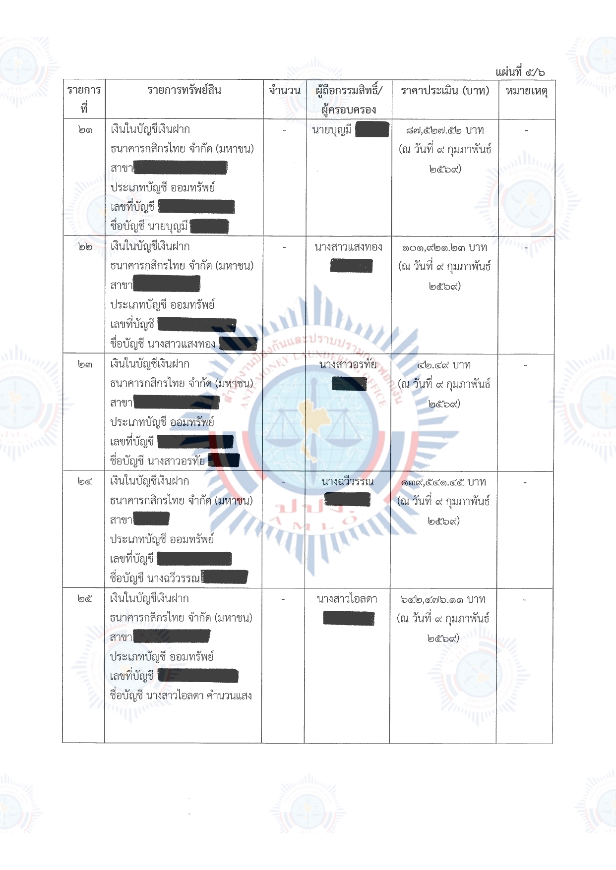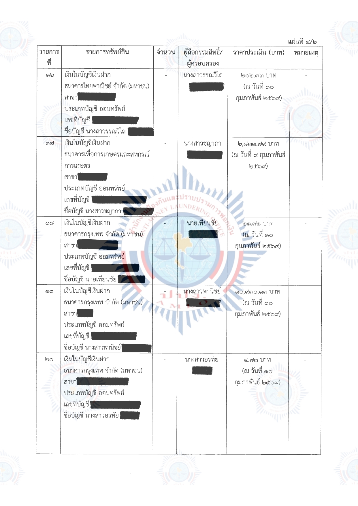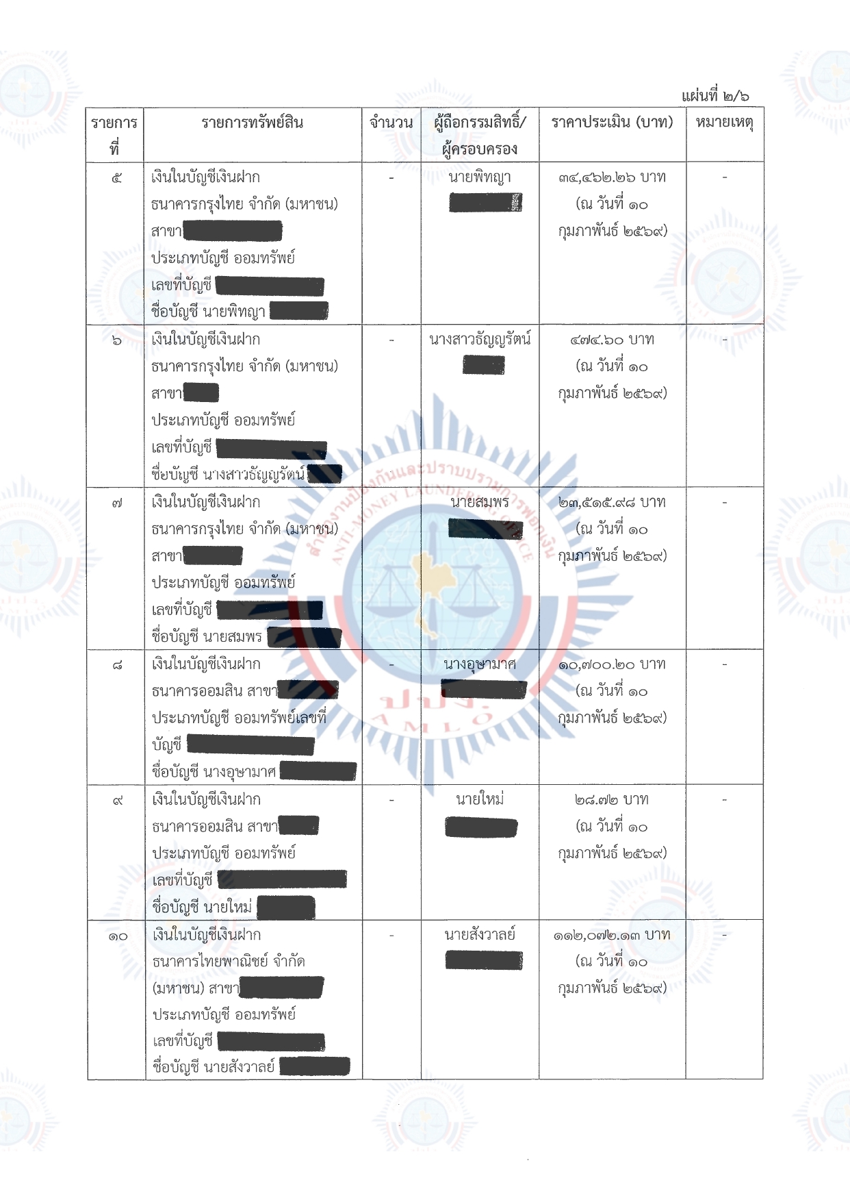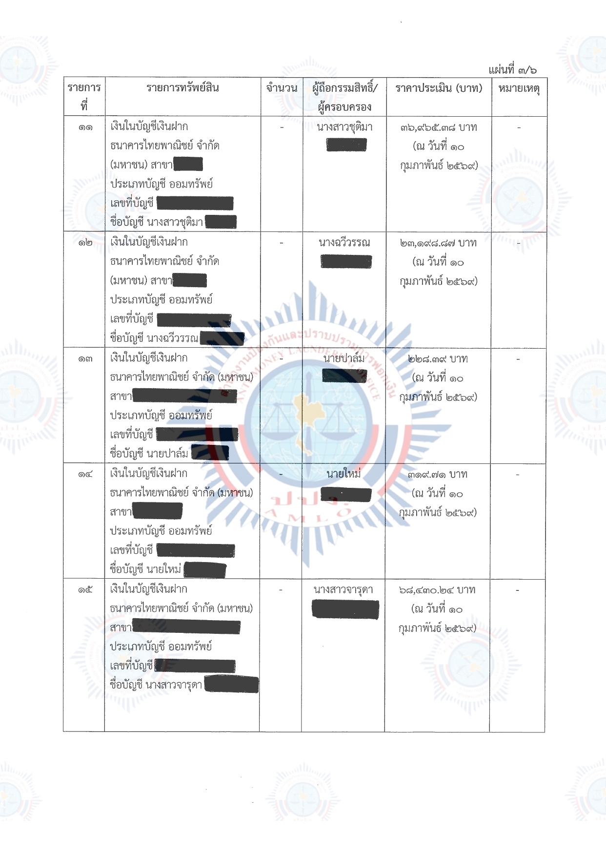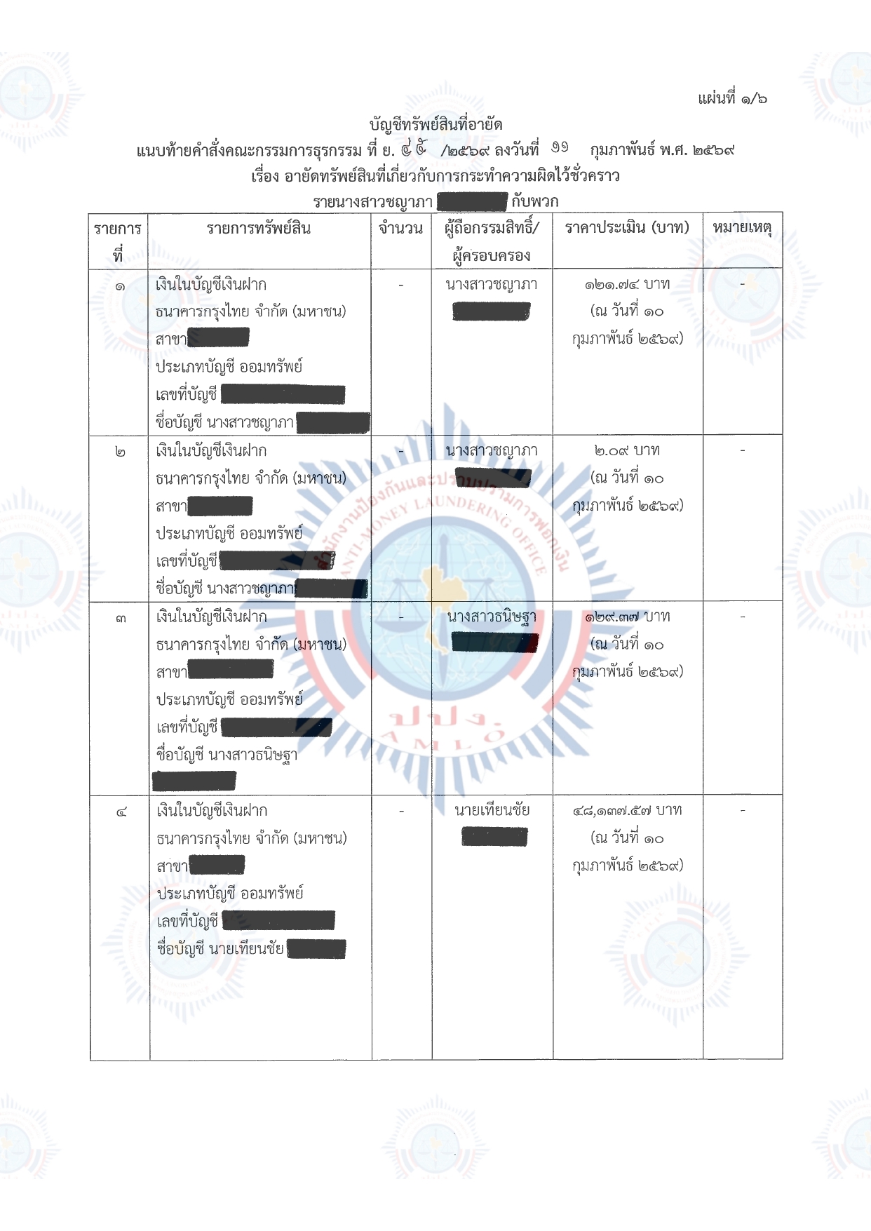 อาศัยอำนาจตามมาตรา 34 (3) และมาตรา forty eight วรรคหนึ่ง แห่งพระราชบัญญัติป้องกันและปราบปรามการฟอกเงิน พ.ศ. 2542 และมติคณะกรรมการธุรกรรมในการประชุมครั้งที่ 2/2569 เมื่อวันที่ 11 กุมภาพันธ์ 2569 คณะกรรมการธุรกรรมจึงมีคำสั่งอายัดทรัพย์สินที่เกี่ยวกับการกระทำความผิดไว้ชั่วคราว จำนวน 27 รายการ พร้อมดอกผล รวมราคาประเมินทั้งสิ้นประมาณ 1,347,514.23 บาท มีกำหนดไม่เกิน 90 วัน นับตั้งแต่วันที่ 11 กุมภาพันธ์ 2569 ถึงวันที่ 11 พฤษภาคม 2569 ตามบัญชีทรัพย์สินแนบท้ายคำสั่งนี้
