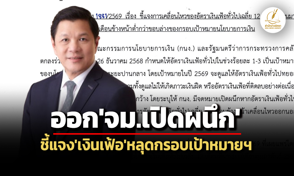 สำนักข่าวอิศรา . รายงานว่า เมื่อวันที่ 20 มี.ค.2569 นายวิทัย รัตนากร ผู้ว่าการธนาคารแห่งประเทศไทย (ธปท.) ประธานคณะกรรมการนโยบายการเงิน ออกจดหมายเปิดผนึกชี้แจงการเคลื่อนไหวของอัตราเงินเฟ้อออกนอกกรอบเป้าหมายนโยบายการเงิน (หนังสือที่ ธปท.1881/2569 เรื่อง ชี้แจงการเคลื่อนไหวของอัตราเงินเฟ้อทั่วไปเฉลี่ย 12 เดือนที่ผ่านมา และ 12 เดือนข้างหน้าต่ำกว่าขอบล่างของกรอบเป้าหมายนโยบายการเงิน) ถึง รมว.คลัง