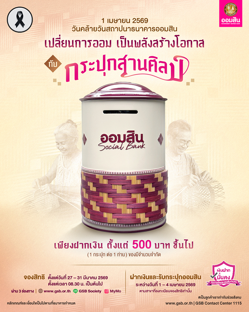 เนื่องในวาระครบรอบ 113 ปี วันที่ 1 เมษายน 2569 ธนาคารออมสินเปิดตัว “กระปุกสานศิลป์” กระปุกออมสินรุ่นพิเศษที่จัดทำขึ้นเพื่อมอบเป็นที่ระลึกแก่ผู้ฝากเงินในวาระดังกล่าว โดยธนาคารออมสินร่วมกับ 4 ชุมชน จาก 4 ภูมิภาค สร้างสรรค์กระปุกออมสินให้เป็นผลงานหัตถศิลป์จากวัสดุท้องถิ่น ถ่ายทอดภูมิปัญญาผ่านงานสานที่ประณีต สะท้อนอัตลักษณ์และวิถีชีวิตไทย เพื่อยกระดับ “การออม” ให้เป็นกลไกการสร้างโอกาส กระจายรายได้ และสนับสนุนอาชีพช่างฝีมือในชุมชน สอดคล้องกับบทบาทธนาคารเพื่อสังคมที่มุ่งสร้างคุณค่าร่วมให้ผู้คน สังคม และธุรกิจเติบโตไปพร้อมกัน ผู้ที่สนใจสามารถจองสิทธิ์ผ่าน 3 ช่องทางออนไลน์ ได้แก่ เว็บไซต์ www.gsb.or.th, LINE OFFICIAL : GSB Society และแอปพลิเคชัน MyMo ระหว่างวันที่ 27 – 31 มีนาคม 2569 และฝากเงิน ตั้งแต่ 500 บาทขึ้นไป พร้อมรับกระปุกออมสิน ณ สาขาที่ลงทะเบียนจองสิทธิ์ไว้ ตั้งแต่วันที่ 1 – 4 เมษายน 2569 (1 กระปุก ต่อ 1 ท่าน) ของมีจำนวนจำกัด