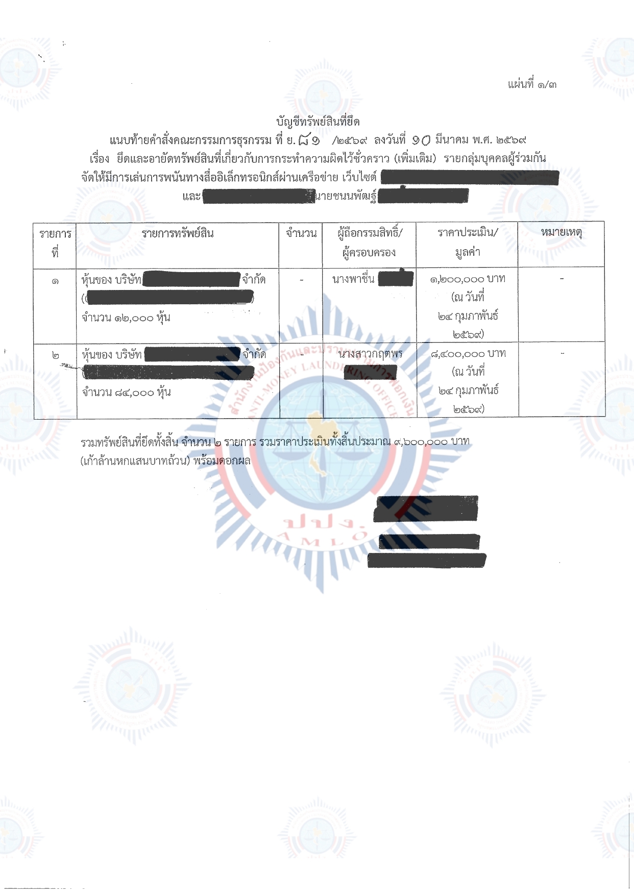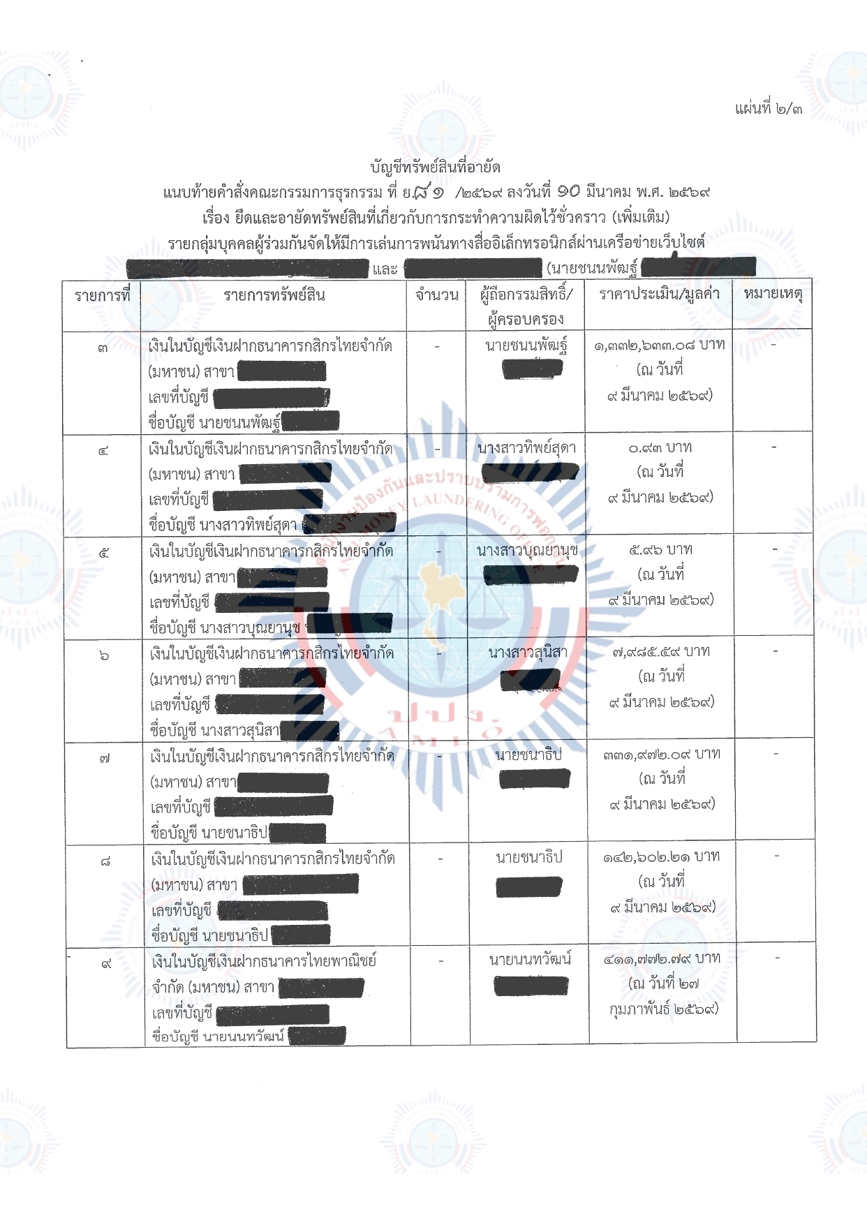 คณะกรรมการธุรกรรมในการประชุมครั้งที่ 3/2569 เมื่อวันที่ 10 มีนาคม 2569 มีมติให้อาศัยอำนาจตามมาตรา 34 (3) และมาตรา forty eight วรรคหนึ่ง แห่ง พ.ร.บ. ป้องกันและปราบปรามการฟอกเงิน พ.ศ. 2542 สั่งยึดและอายัดทรัพย์สินจำนวน 49 รายการ พร้อมดอกผล มีกำหนดไม่เกิน 90 วัน ตั้งแต่วันที่ 10 มีนาคม 2569 ถึงวันที่ 7 มิถุนายน 2569 โดยแบ่งเป็น