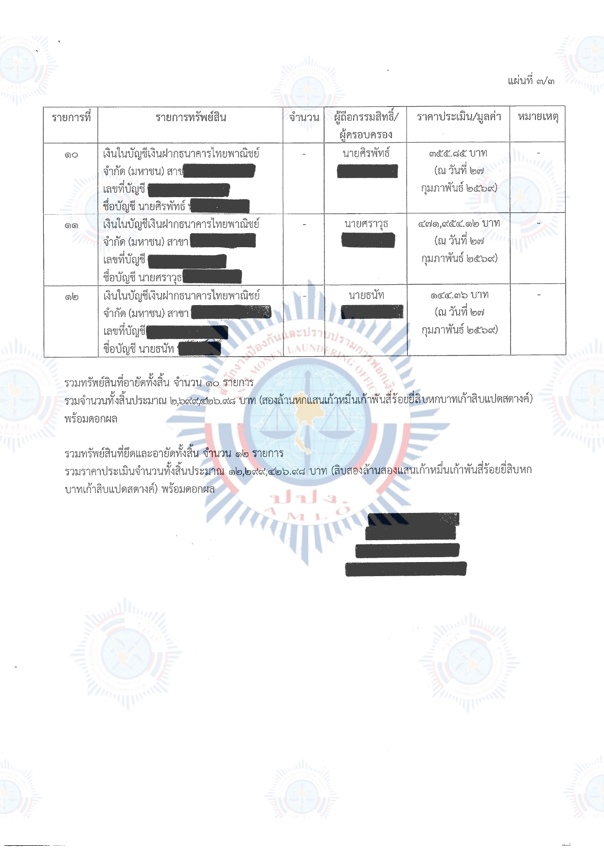 รายการทรัพย์สินที่อายัด (รายการที่ 37-49) มูลค่าประมาณ 3,091,563.forty eight บาท ประกอบด้วย