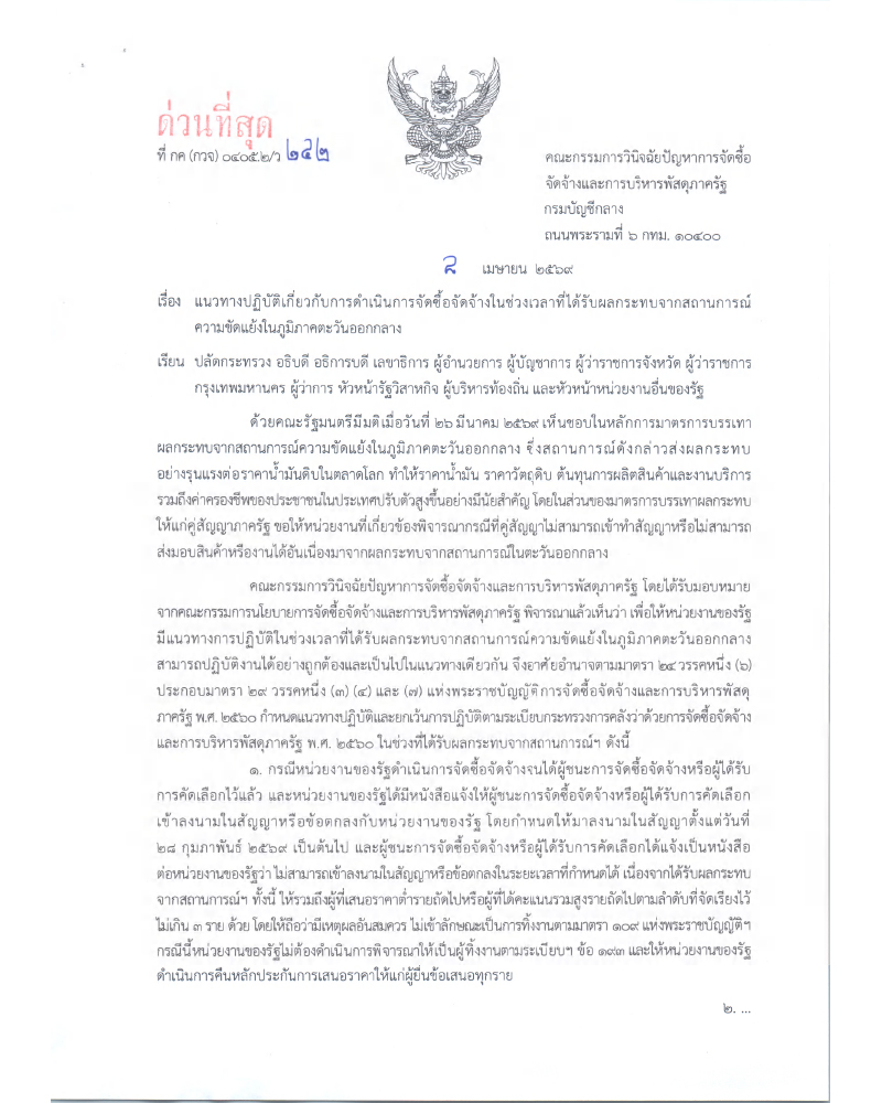 สำนักข่าวอิศรา . รายงานว่า วันที่ 10 เมษายน 2569 คณะกรรมการวินิจฉัยปัญหาการจัดซื้อจัดจ้างและการบริหารพัสดุภาครัฐ กรมบัญชีกลาง ทำหนังสือเรียนถึงปลัดกระทรวง อธิบดี อธิการบดี เลขาธิการ ผู้อำนวยการ ผู้บัญชาการ ผู้ว่าราชการจังหวัด ผู้ว่าราชการ กรุงเทพมหานคร ผู้ว่าการ หัวหน้ารัฐวิสาหกิจ ผู้บริหารท้องถิ่น และหัวหน้าหน่วยงานอื่นของรัฐ เรื่อง แนวทางปฏิบัติเกี่ยวกับการดำเนินการจัดซื้อจัดจ้างในช่วงเวลาที่ได้รับผลกระทบจากสถานการณ์ ความขัดแย้งในภูมิภาคตะวันออกกลาง ลงนามโดยนางแพตริเซีย มงคลวนิช อธิบดีกรมบัญชีกลาง ปฏิบัติราชการแทน ปลัดกระทรวงการคลัง ในฐานะประธานกรรมการวินิจฉัย มีเนื้อหาดังนี้