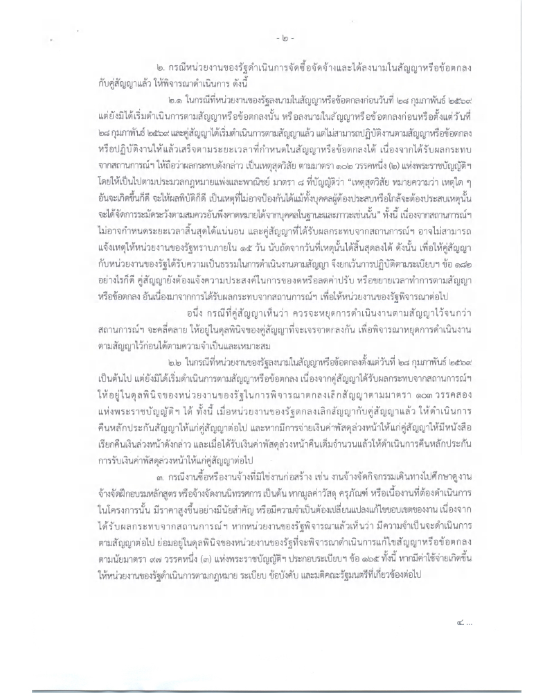 2.1 ในกรณีที่หน่วยงานของรัฐลงนามในสัญญาหรือข้อตกลงก่อนวันที่ 28 ก.พ. 2569 แต่ยังมิได้เริ่มดำเนินการตามสัญญาหรือข้อตกลงนั้น หรือลงนามในสัญญาหรือข้อตกลงก่อนหรือตั้งแต่วันที่ 28 ก.พ. 2569 และคู่สัญญาได้เริ่มดำเนินการตามสัญญาแล้ว แต่ไม่สามารถปฏิบัติงานตามสัญญาหรือข้อตกลง หรือปฏิบัติงานให้แล้วเสร็จตามระยะเวลาที่กำหนดในสัญญาหรือข้อตกลงได้ เนื่องจากได้รับผลกระทบ จากสถานการณ์ฯ ให้ถือว่าผลกระทบดังกล่าว เป็นเหตุสุดวิสัย ตามมาตรา 102 วรรคหนึ่ง (2) แห่งพ.ร.บ.การจัดซื้อจัดจ้างและการบริหารพัสดุภาครัฐ พ.ศ. 2560 โดยให้เป็นไปตามประมวลกฎหมายแพ่งและพาณิชย์ มาตรา 4 ที่บัญญัติว่า “เหตุสุดวิสัย หมายความว่า เหตุใด ๆ อันจะเกิดขึ้นก็ดี จะให้ผลพิบัติก็ดี เป็นเหตุที่ไม่อาจป้องกันได้แม้ทั้งบุคคลผู้ต้องประสบหรือใกล้จะต้องประสบเหตุนั้น จะได้จัดการระมัดระวังตามสมควรอันพึงคาดหมายได้จากบุคคลในฐานะและภาวะเช่นนั้น”