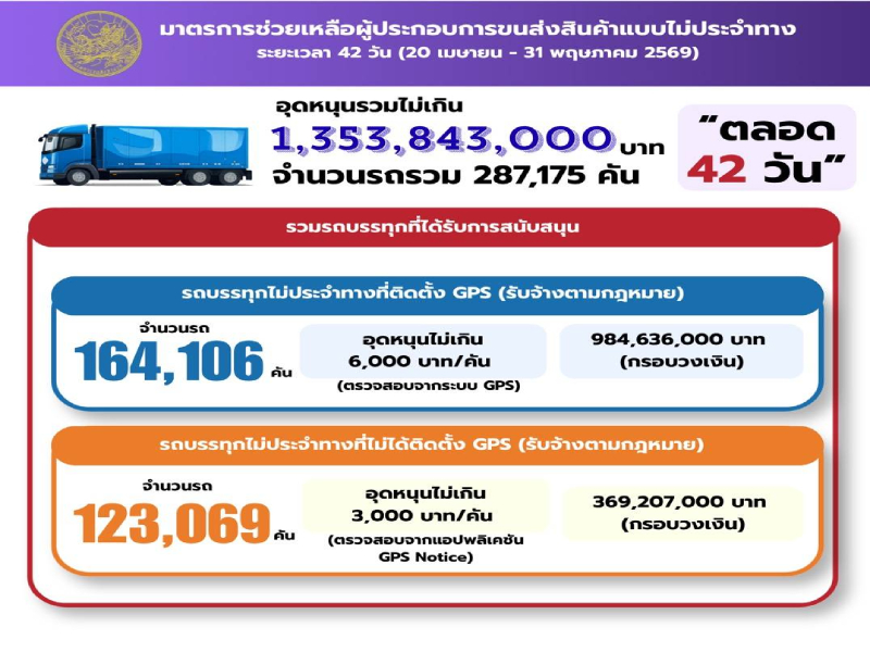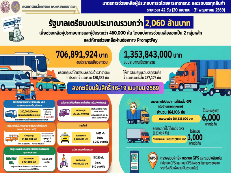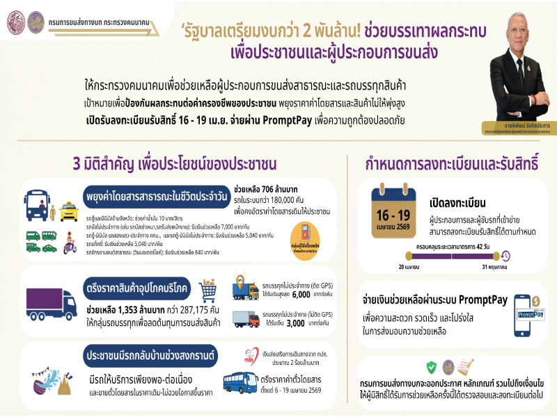 อธิบดีกรมการขนส่งทางบก กล่าวเพิ่มเติมว่า สำหรับกลุ่มผู้ประกอบการขนส่งและผู้ขับรถที่เข้าข่ายได้รับการช่วยเหลือ กรมการขนส่งทางบกจะเปิดให้ ลงทะเบียนรับสิทธิ์ระหว่างวันที่ 16 – 19 เมษายน 2569 โดยจะจ่ายเงินช่วยเหลือผ่านระบบ PromptPay เพื่อช่วยเหลือผู้ประกอบการขนส่งในการเดินรถตลอดระยะเวลา 42 วัน (20 เม.ย. – 31 พ.ค. 69) โดยทางกรมการขนส่งทางบกจะออกประกาศ หลักเกณฑ์ รวมไปถึงเงื่อนไขให้ผู้มีสิทธิ์ได้รับการช่วยเหลือครั้งนี้ได้ตรวจสอบและลงทะเบียนต่อไป ทั้งนี้ มาตรการทั้งหมดเป็นการแสดงให้เห็นถึงความมุ่งมั่นของรัฐบาลและกระทรวงคมนาคม ในการดูแลรักษาสมดุลทั้งระบบเศรษฐกิจ สภาพคล่องของผู้ประกอบการ และคุณภาพชีวิตของพี่น้องประชาชนให้ก้าวผ่านวิกฤตพลังงานครั้งนี้ไปด้วยกัน