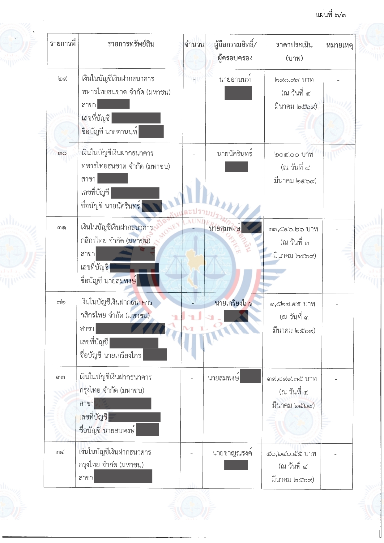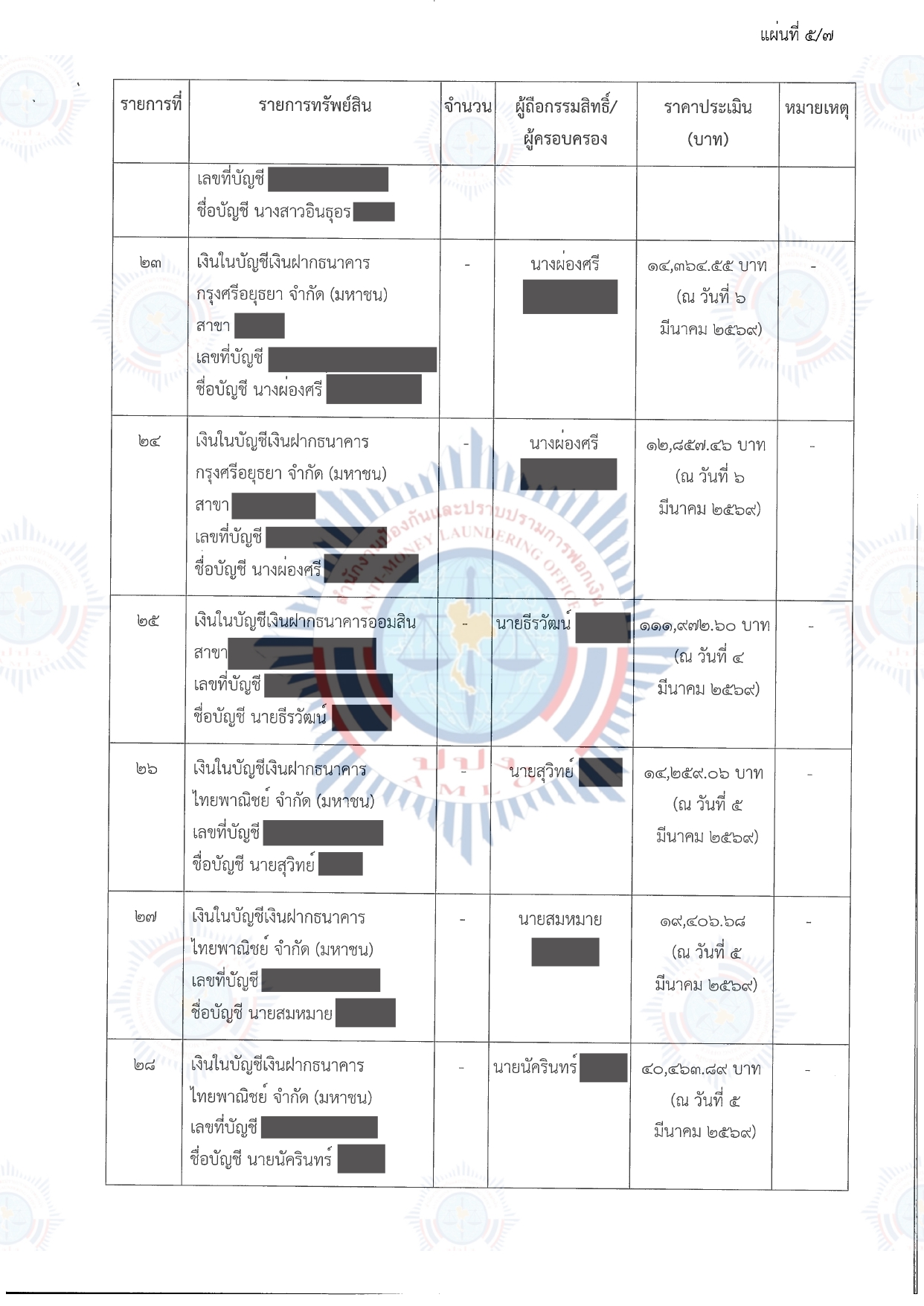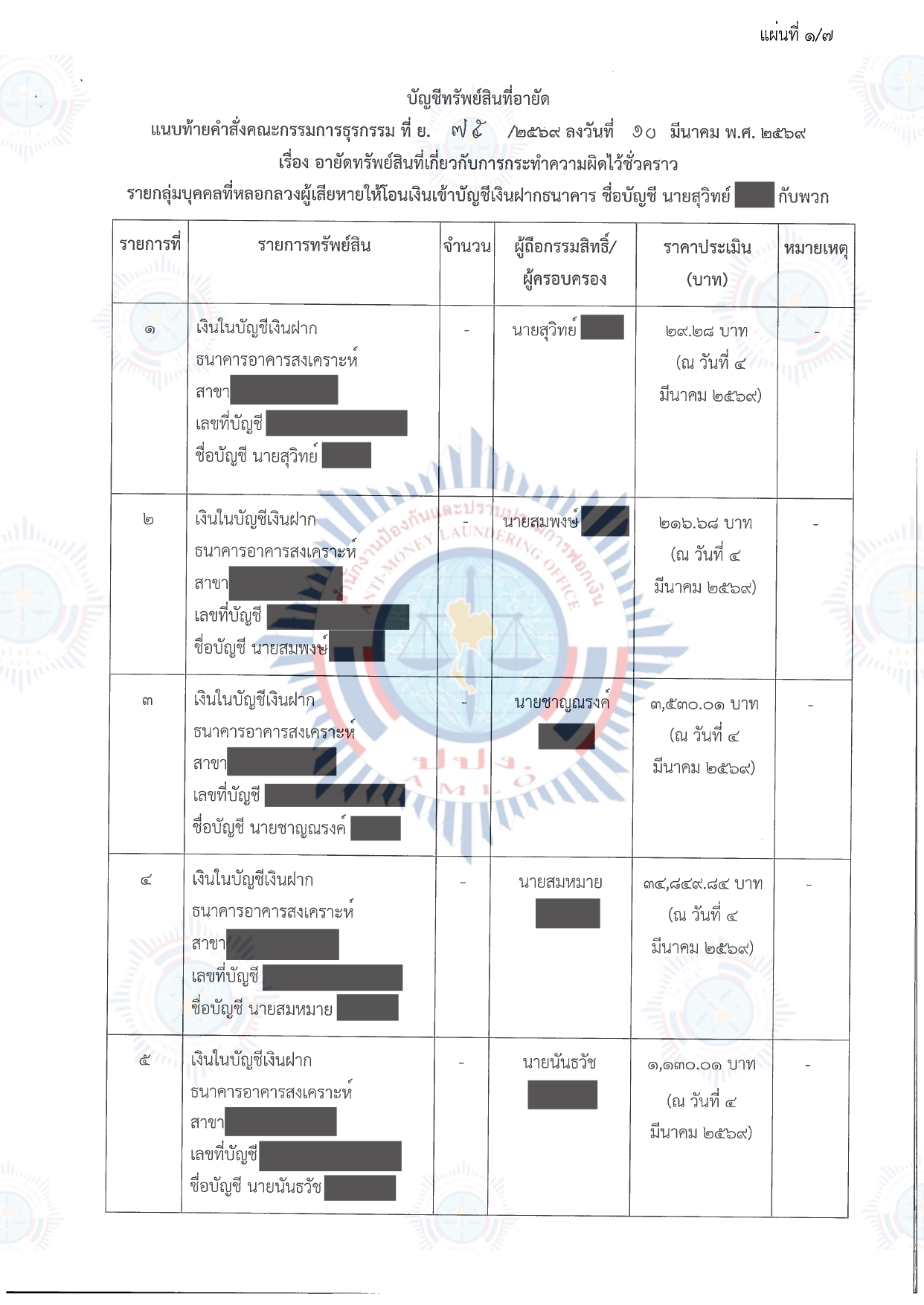 คณะกรรมการธุรกรรมในการประชุม ครั้งที่ 3/2569 เมื่อวันที่ 10 มีนาคม 2569 จึงมีมติให้อายัดทรัพย์สินที่เกี่ยวกับการกระทำความผิดไว้ชั่วคราว บัญชีเงินฝาก จำนวน 35 รายการ พร้อมดอกผล มีกำหนดไม่เกิน 90 วัน นับตั้งแต่วันที่ 10 มีนาคม 2569 ถึงวันที่ 7 มิถุนายน 2569 รวมราคาประเมินทั้งสิ้นประมาณ 503,408.25 บาท