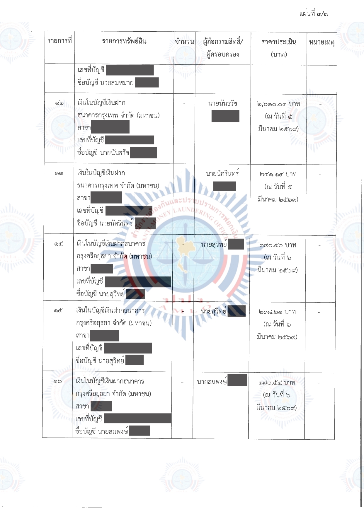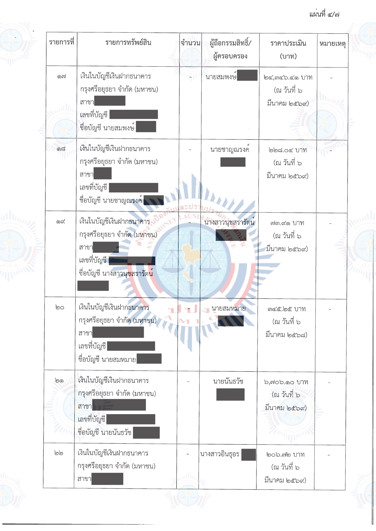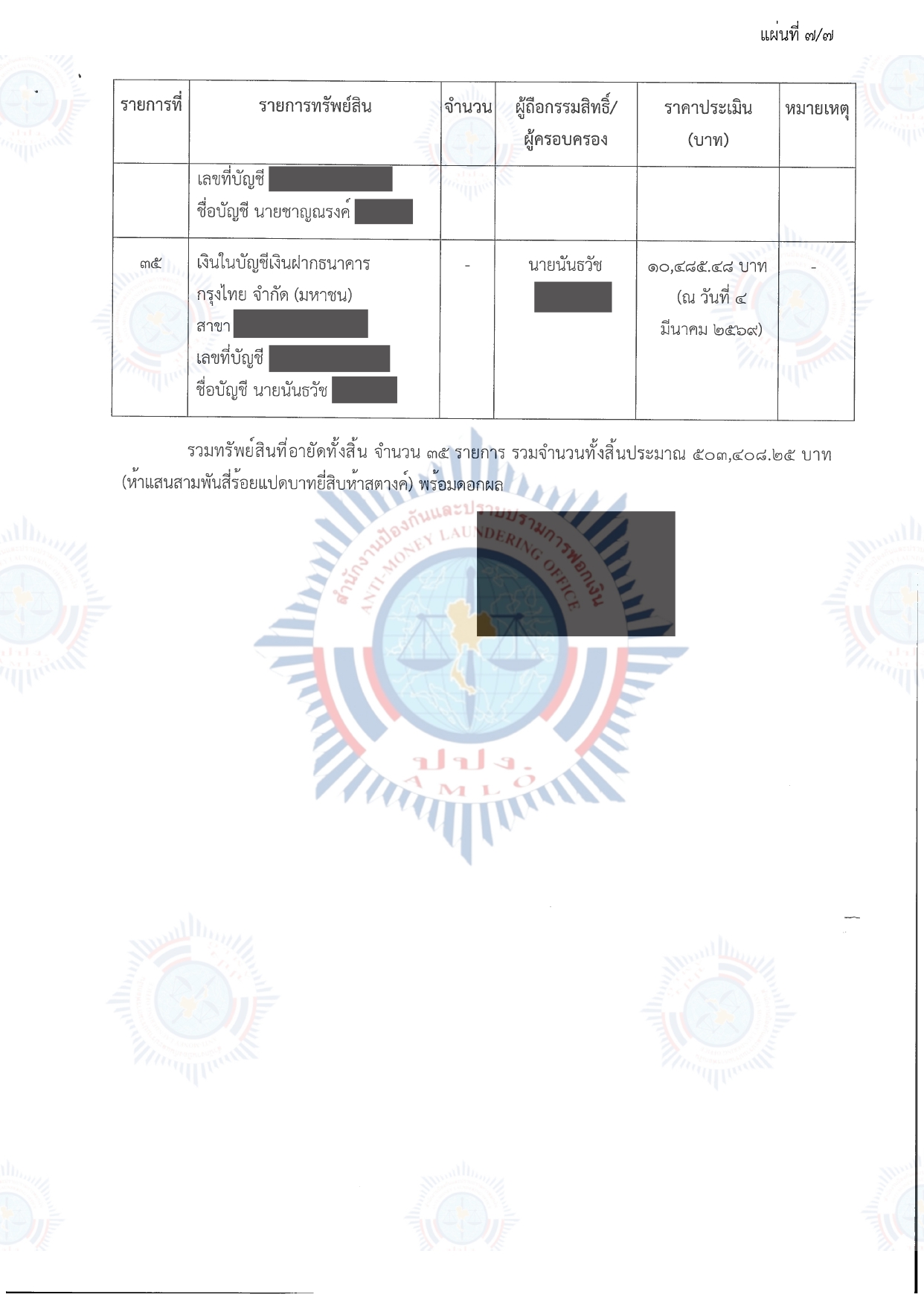 คณะกรรมการธุรกรรมในการประชุม ครั้งที่ 3/2569 เมื่อวันที่ 10 มีนาคม 2569 จึงมีมติให้อายัดทรัพย์สินที่เกี่ยวกับการกระทำความผิดไว้ชั่วคราว บัญชีเงินฝาก จำนวน 35 รายการ พร้อมดอกผล มีกำหนดไม่เกิน 90 วัน นับตั้งแต่วันที่ 10 มีนาคม 2569 ถึงวันที่ 7 มิถุนายน 2569 รวมราคาประเมินทั้งสิ้นประมาณ 503,408.25 บาท