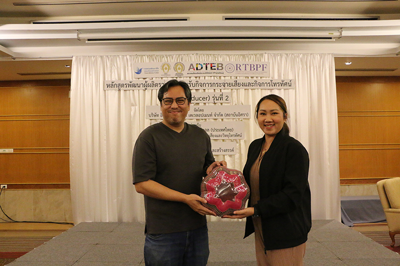 อบรมในครั้งนี้ ได้รับเกียรติจาก คุณโชค วิศวโยธิน ผู้ก่อตั้ง กลุ่ม AI เพื่อธุรกิจและสังคม เป็นวิทยากรบรรยาย หัวข้อ “ทักษะและการเรียนรู้เรื่อง AI เพื่อการผลิตรายการ” แก่ผู้เข้าร่วมอบรมหลักสูตร The Producer รุ่นที่ 2 โดย คุณศศิธร หยองเอ่น เป็นตัวแทนมอบของที่ระลึกแก่วิทยากร